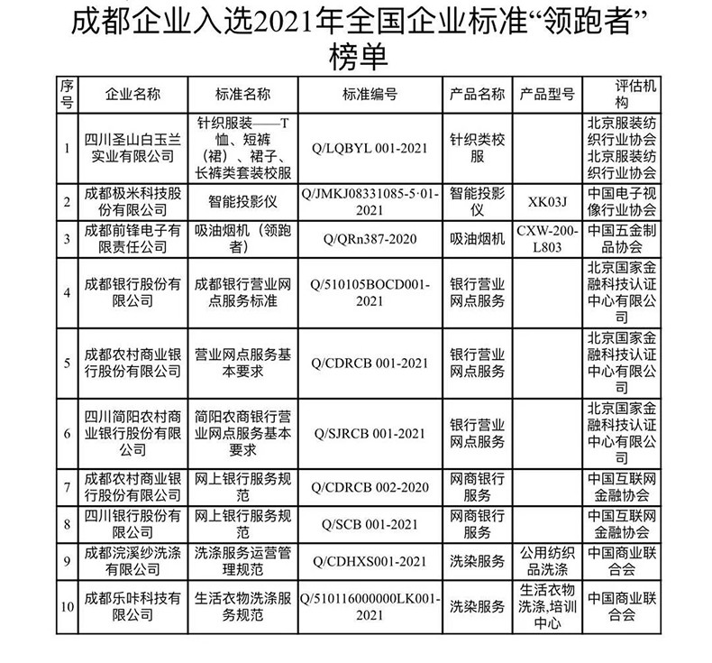 成都市入選全國“領跑者”榜單的企業標準將產生示范帶動作用,推動質量提升,促進消費升級,助推成都相關產業邁向價值鏈中高端,更好滿足人民日益增長的美好生活需要。