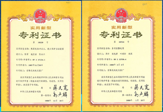1986年,前鋒QFM14型熱水器誕生的,這是中國首臺雙保護(電脈沖點火技術和熄火保護裝置)燃氣熱水器,并正式將電脈沖點火技術和熄火保護裝置申請為前鋒專利,此雙重保護裝置專利技術填補了國內熱水器安全的行業空白。